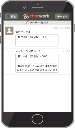着信履歴(着信名称、番号と転送名称、番号)をアプリ(ChatWork等)で確認することができます。